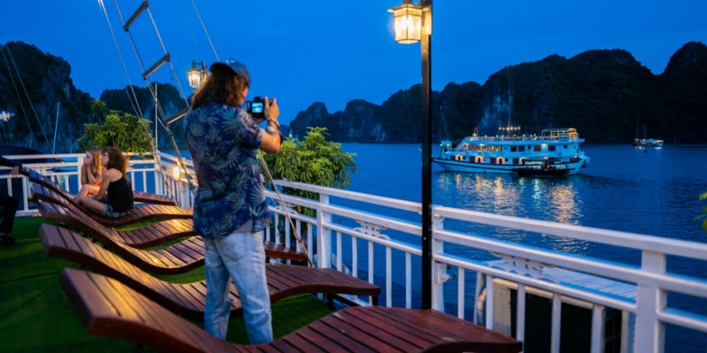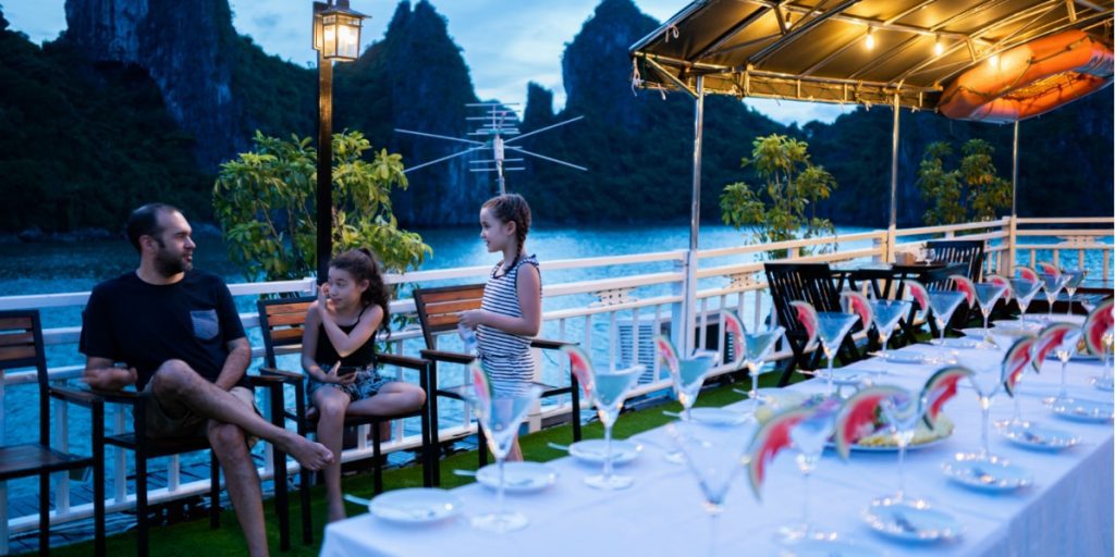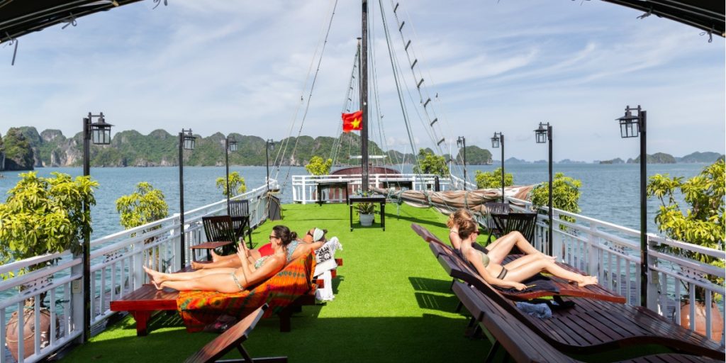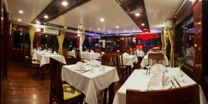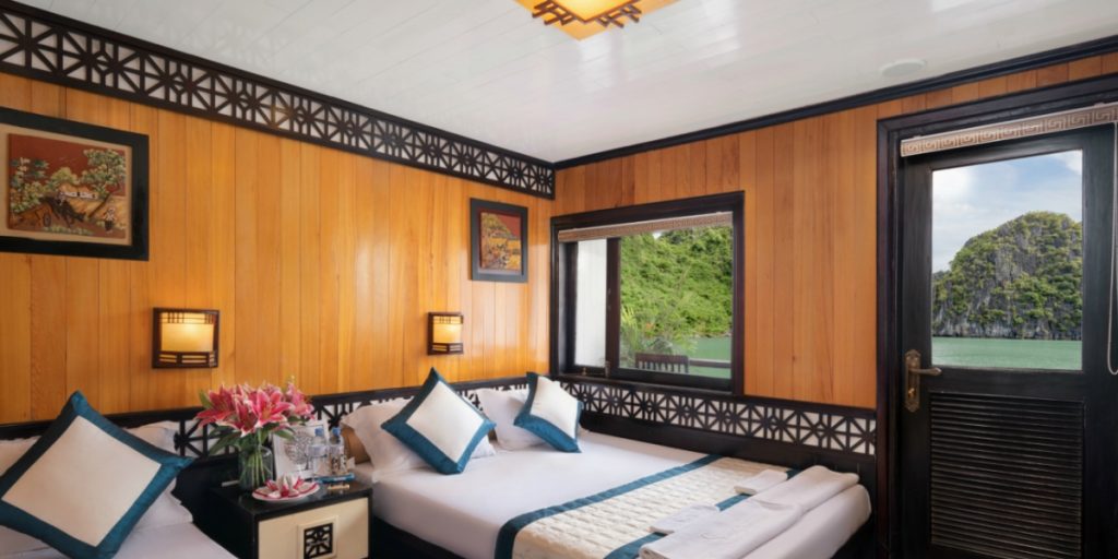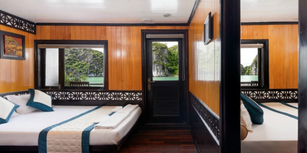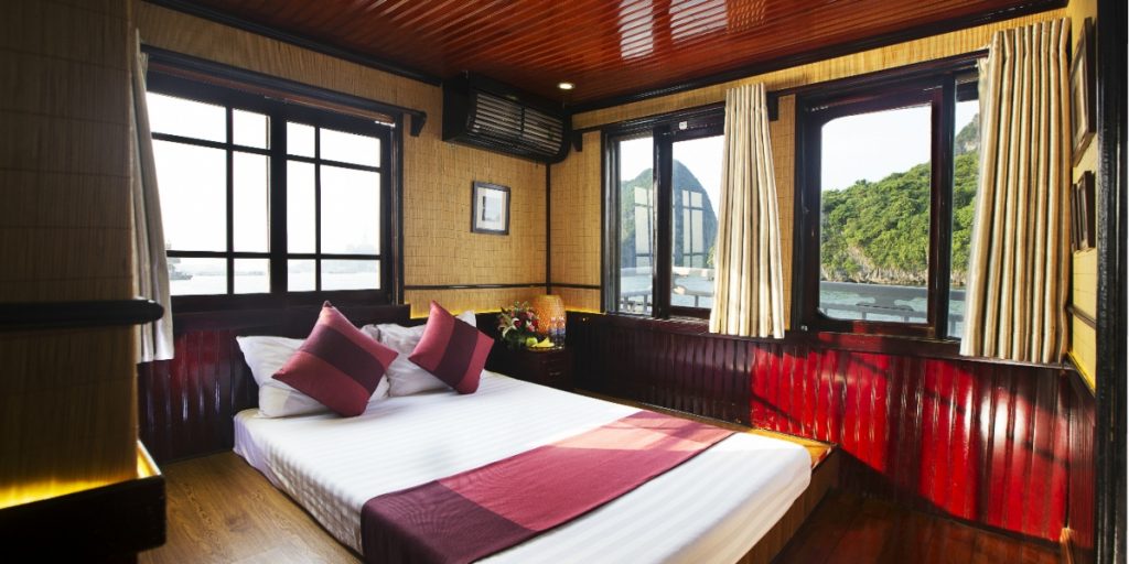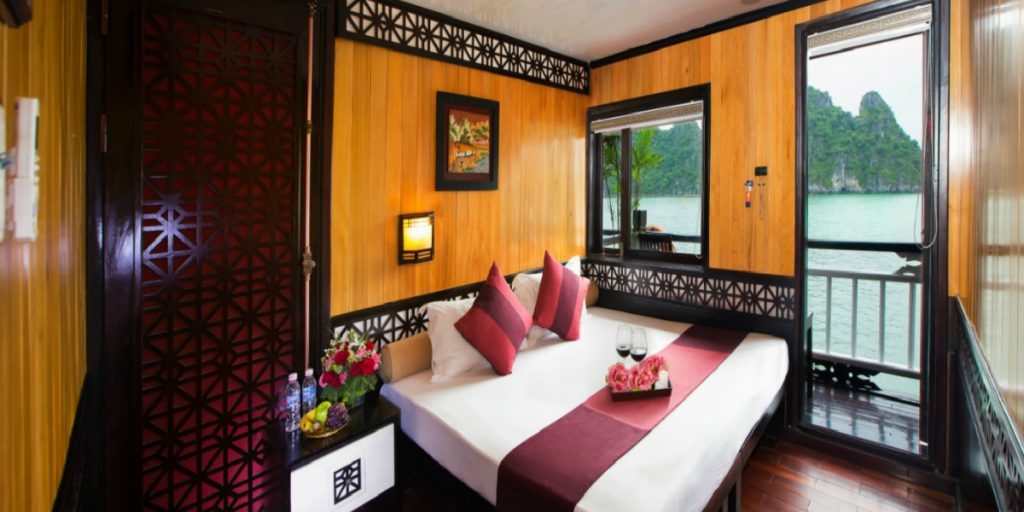 The ship is inspired by Vietnam’s traditional culture which can be seen through its bamboo and wooden decorations. All eight cabins are equipped with large windows and comfortable bedding. Not only will you immerse in the turquoise bay but you can also join other exciting activities such as demonstration cooking class, kayaking, and practicing taichi. You can enjoy sumptuous meals with both traditional and international cuisines prepared by dedicated chefs.